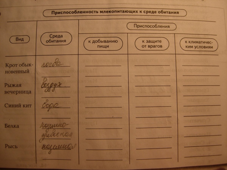 Приспособление млекопитающих к среде обитания таблица
