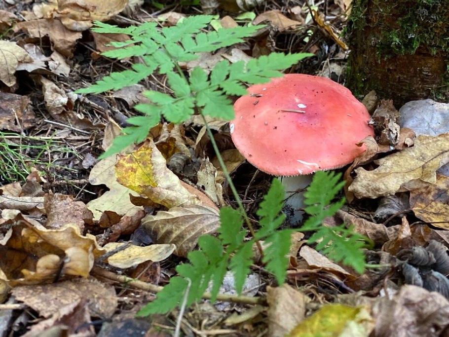 Сыроежка с красной шляпкой и белой ножкой