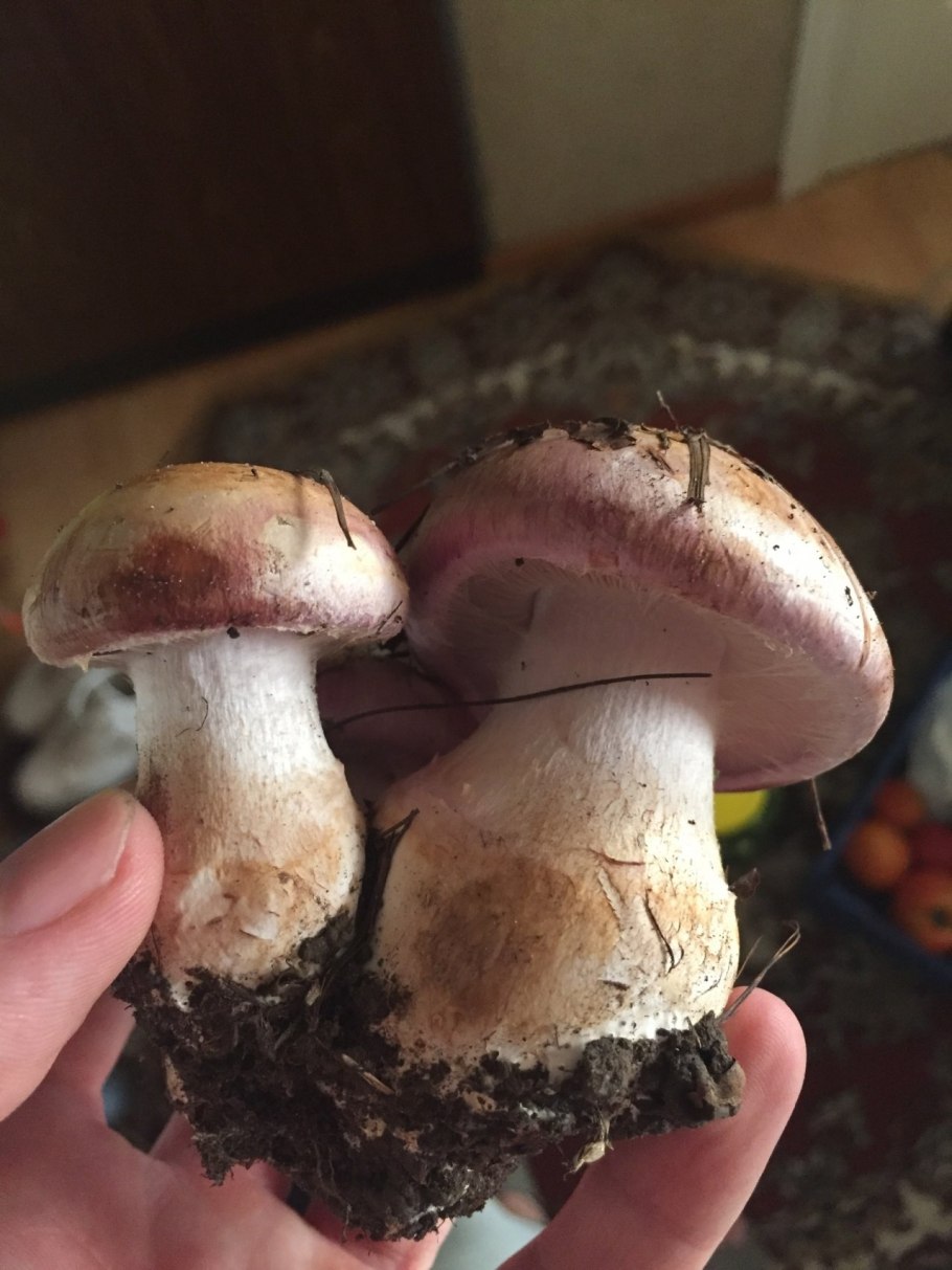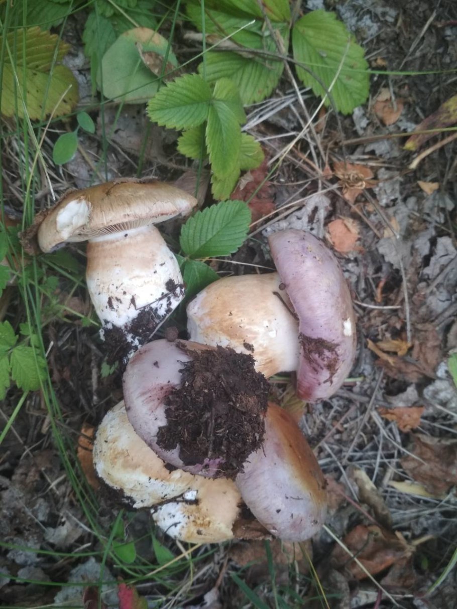 Гриб с фиолетовой шляпкой и толстой ножкой