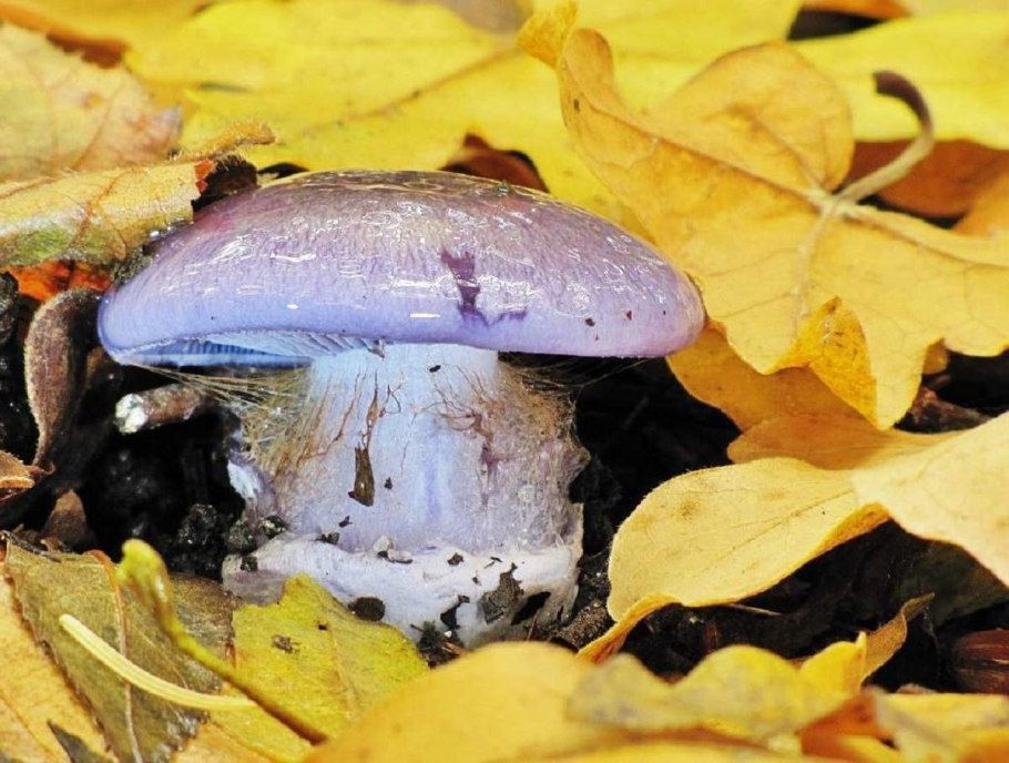 Гриб фиолетового цвета с толстой ножкой