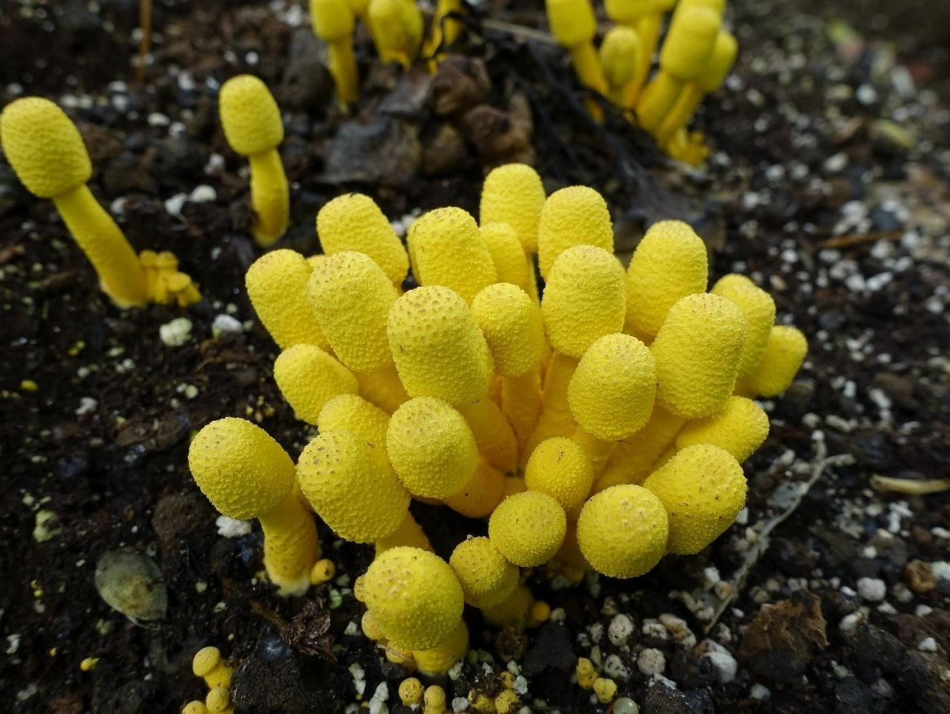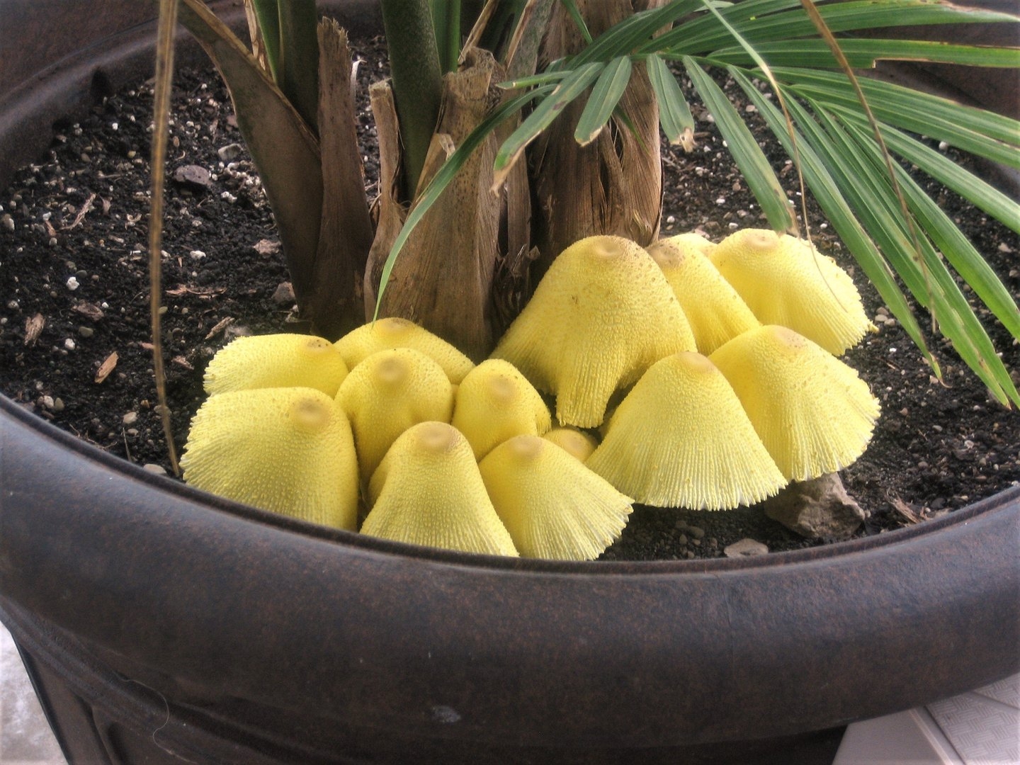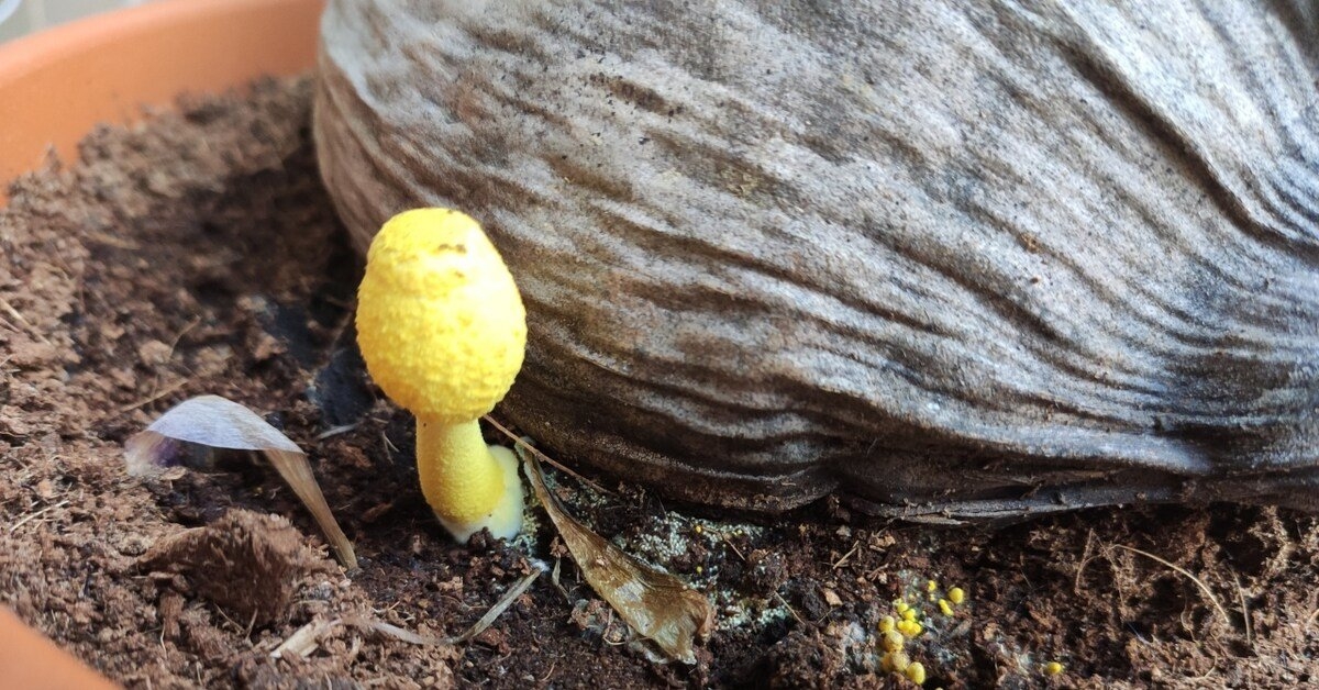 Желтые грибы в цветочном горшке