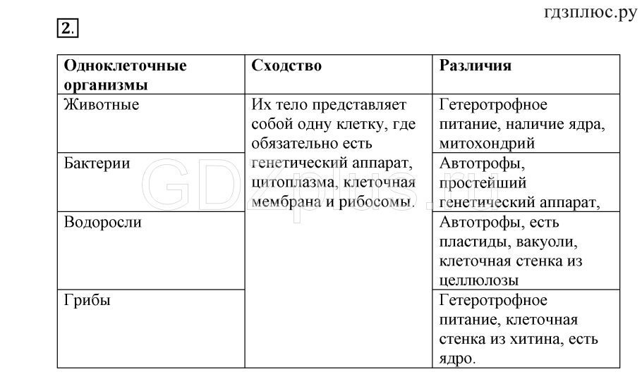 Сходство и различия одноклеточных организмов таблица 5 класс