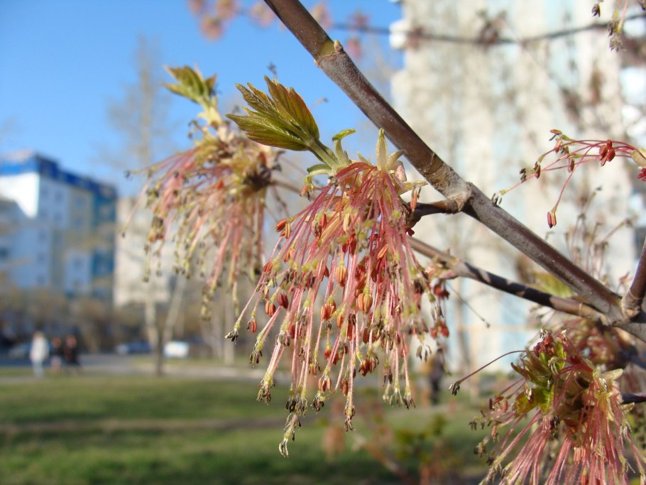 Клен ясенелистный цветет