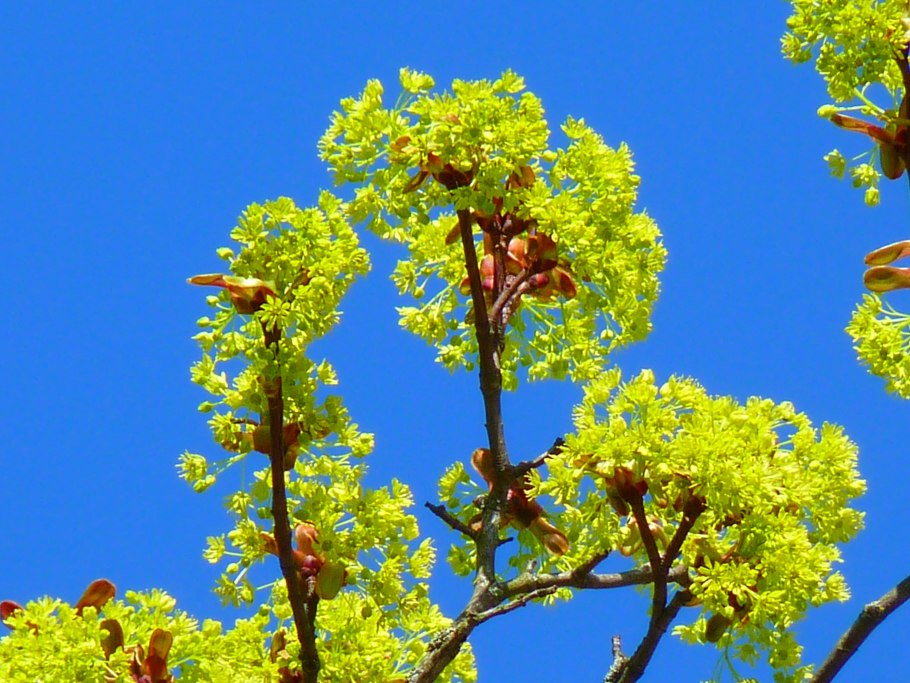 Клен остролистный цветет