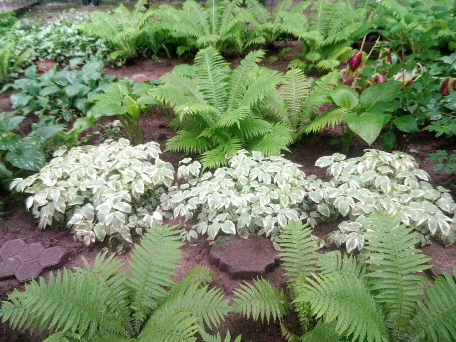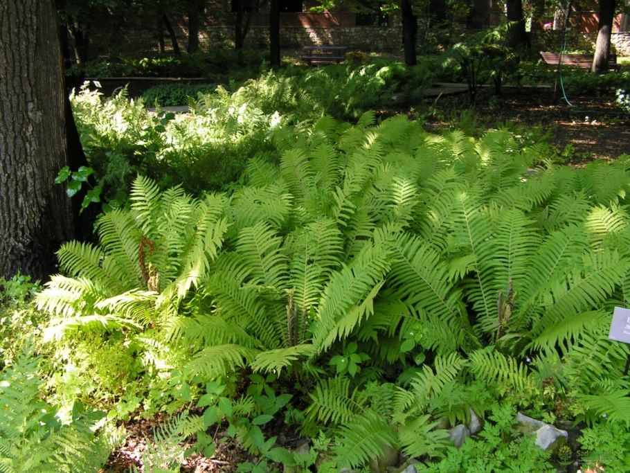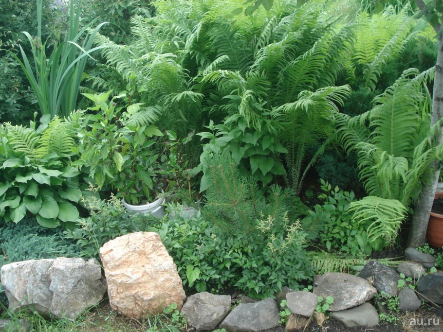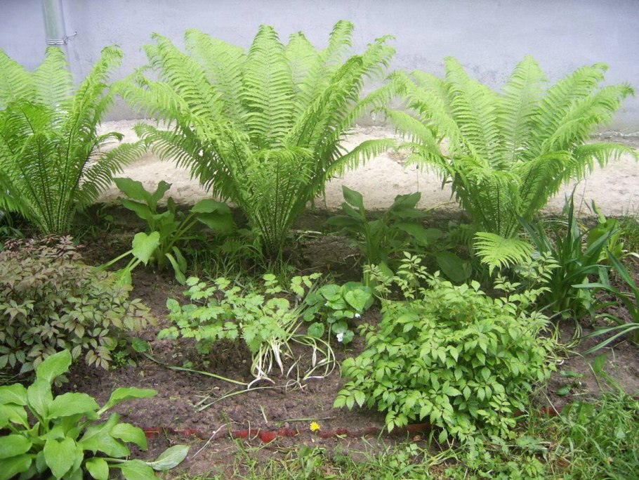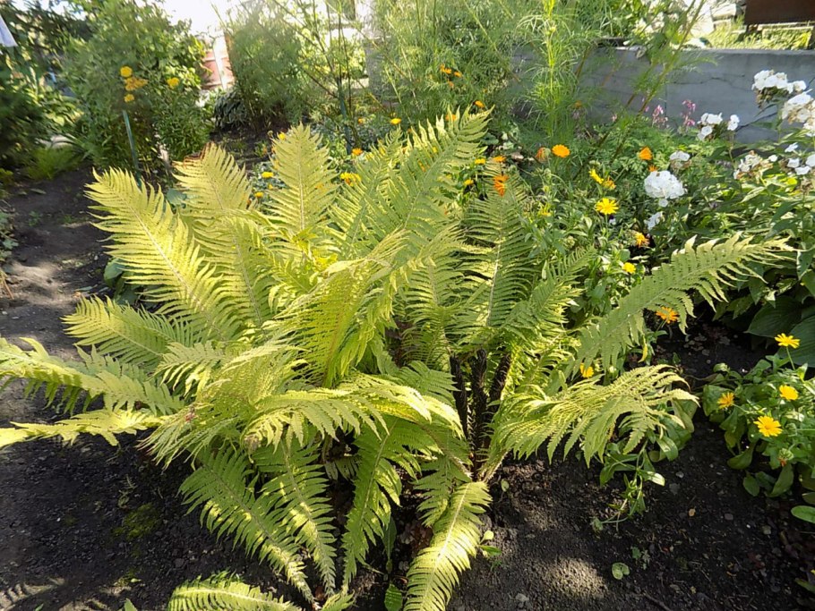 Папоротник страусник на клумбе