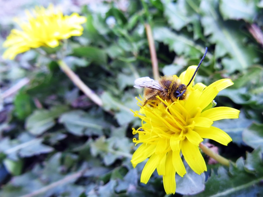 Пчела опыляет одуванчик