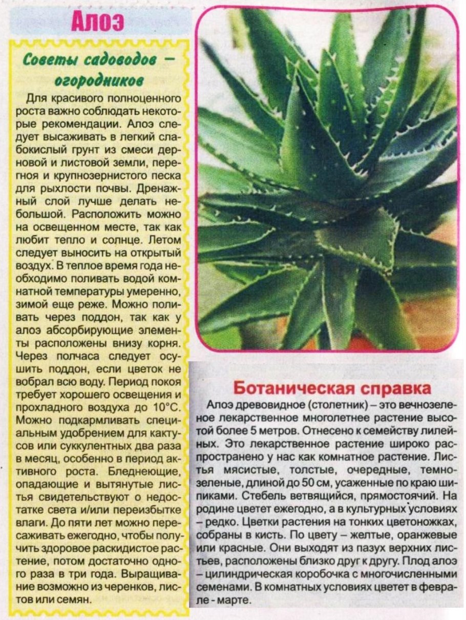 Алоэ паспорт растения для детского сада