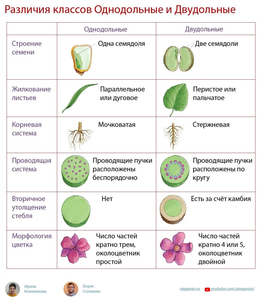 Отличия однодольных и двудольных растений таблица