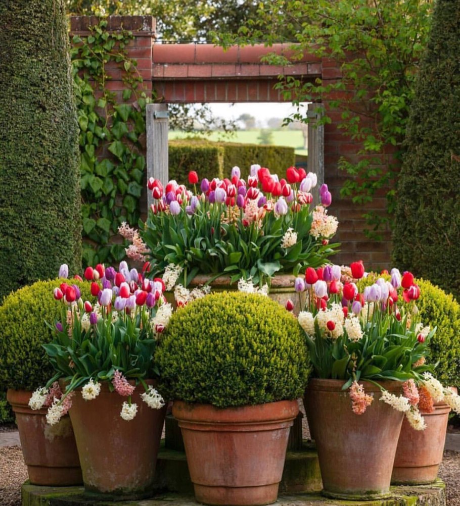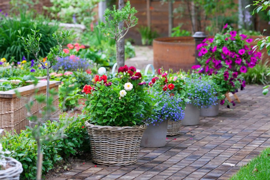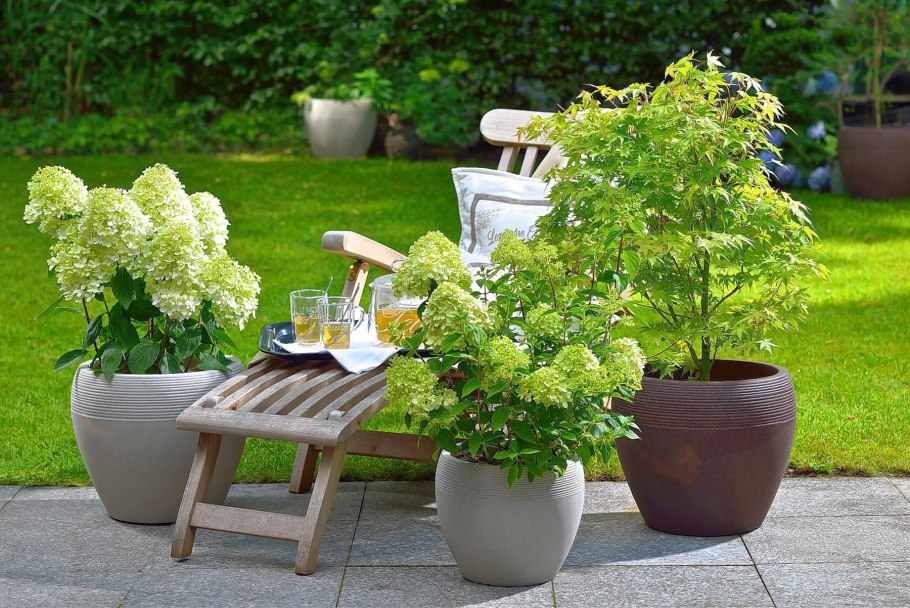 Растения в саду в горшках