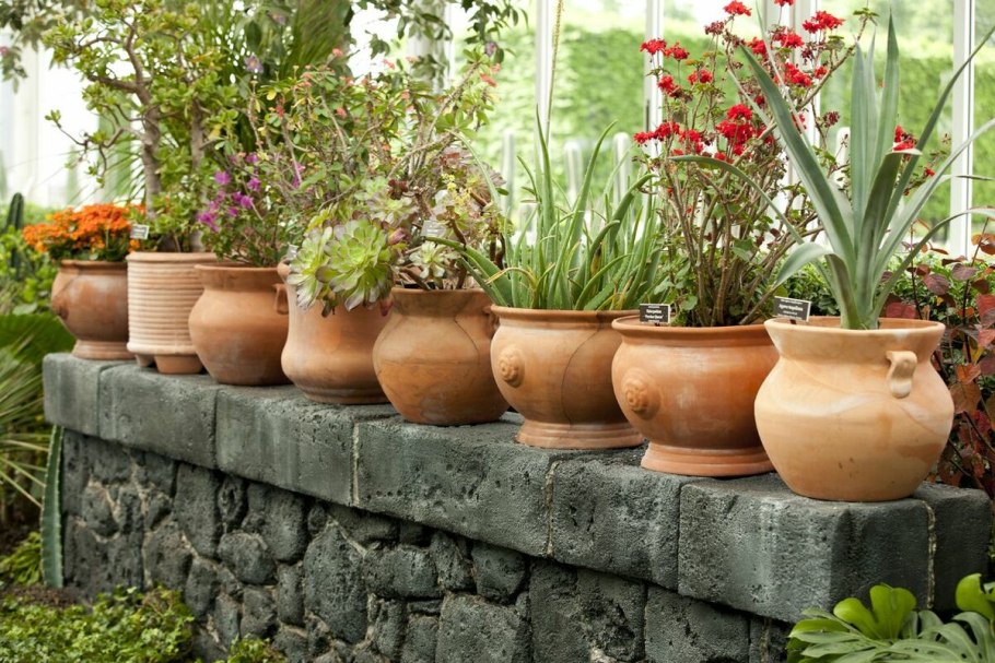Растения в горшках в саду