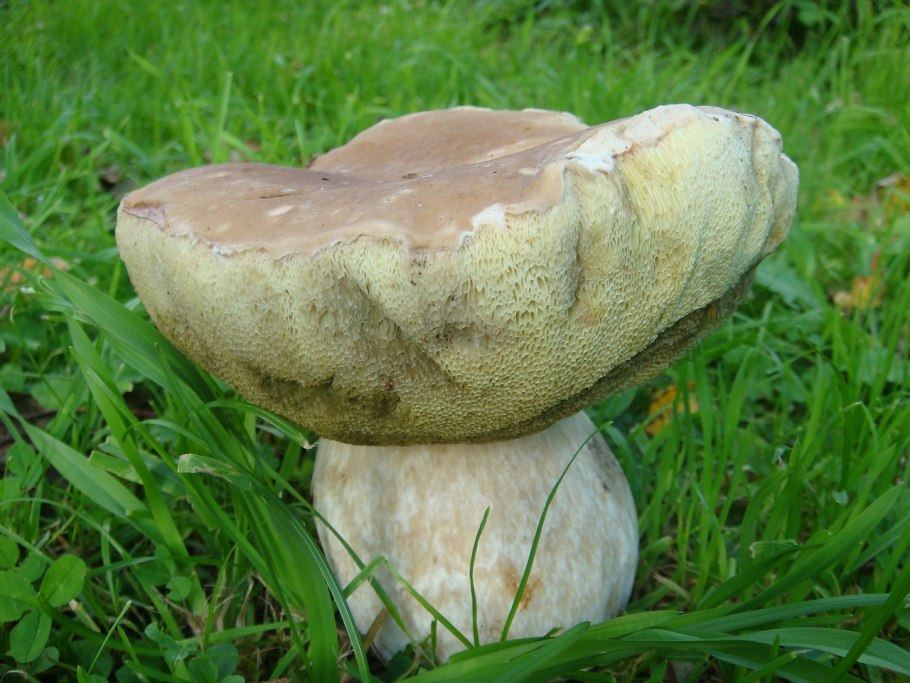 Гриб белого цвета с толстой ножкой губчатый
