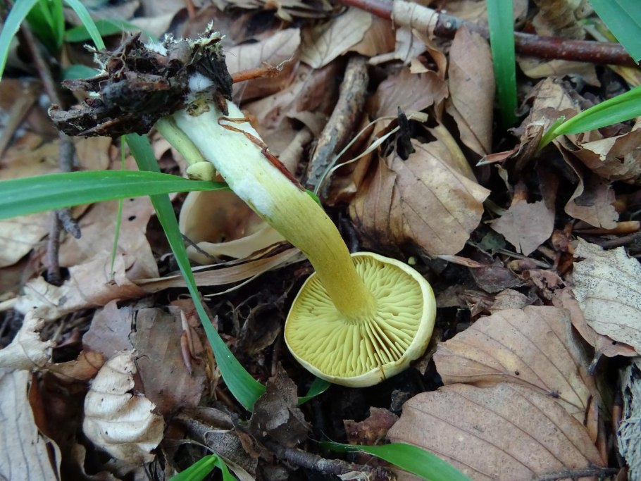 Желтый пластинчатый гриб с толстой ножкой
