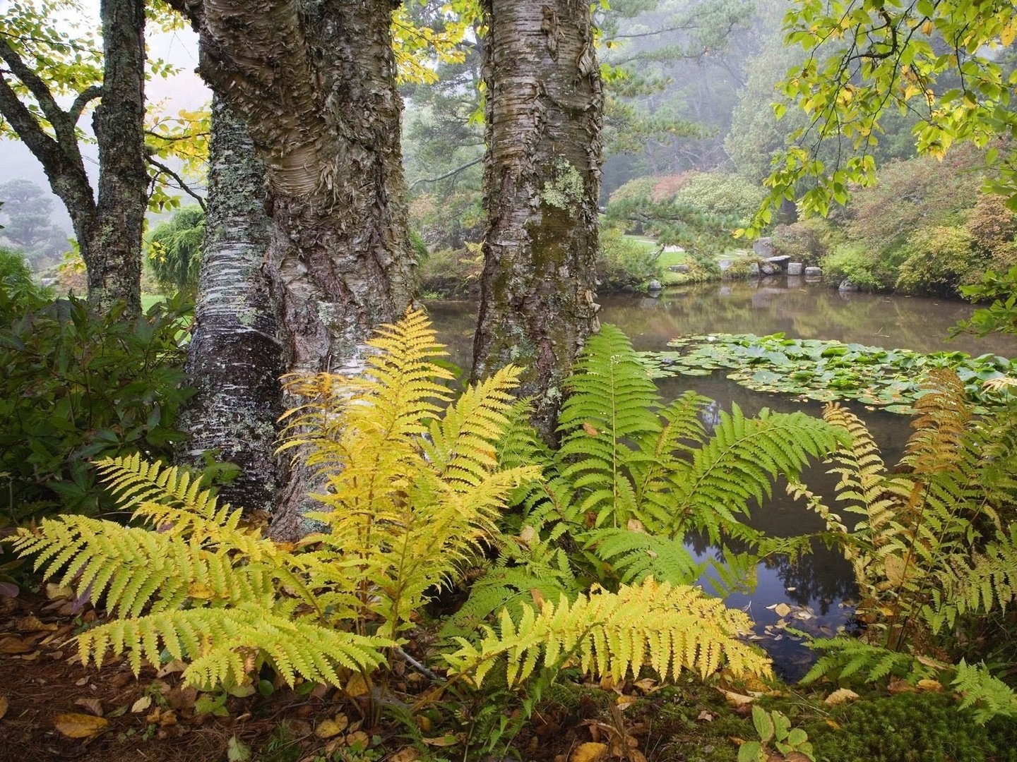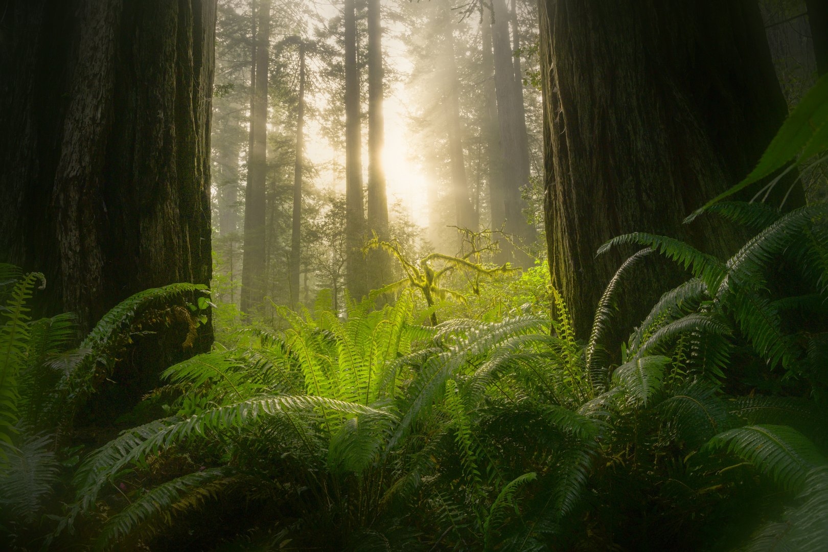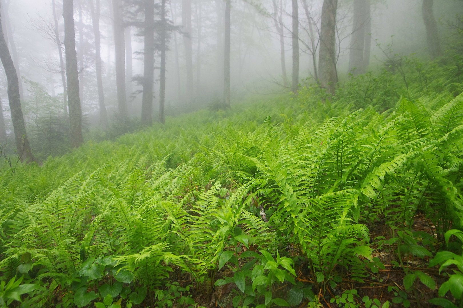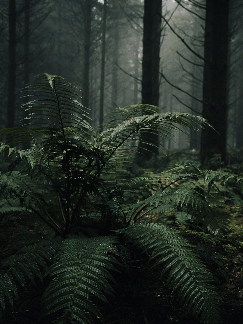 Туманный лес с папоротниками